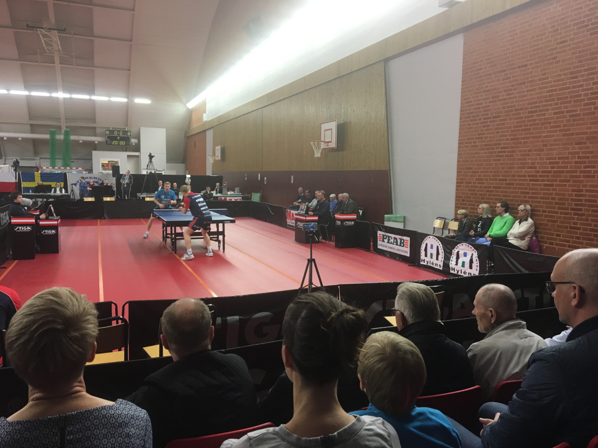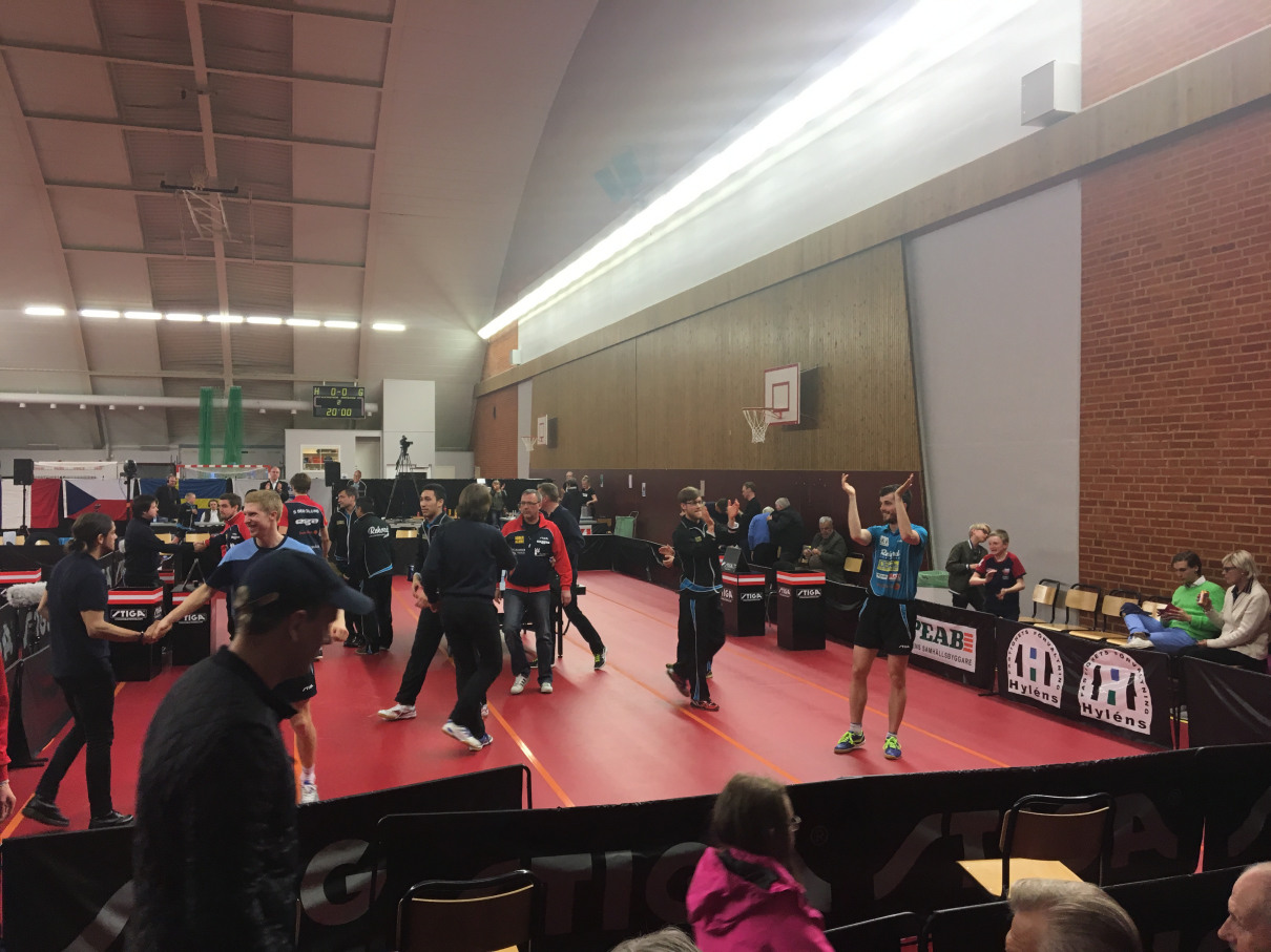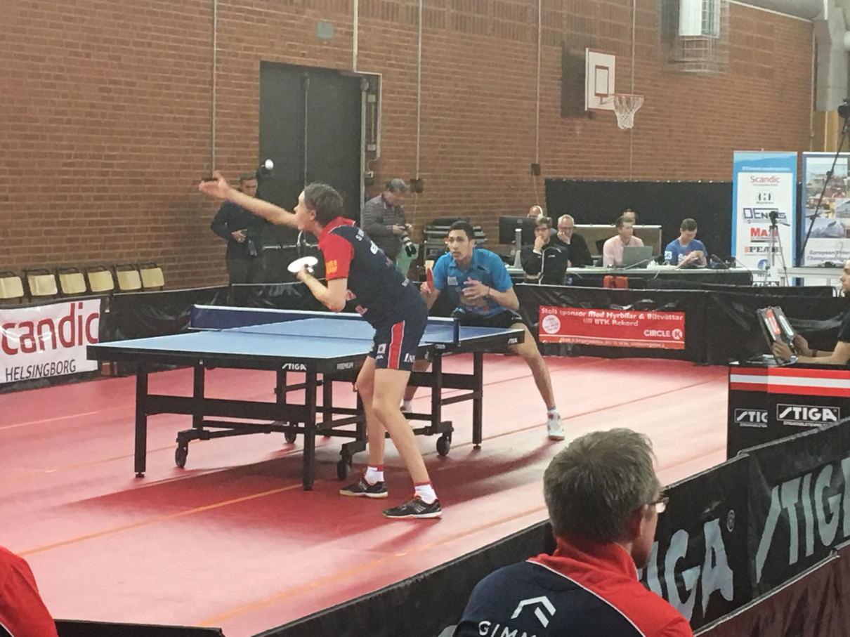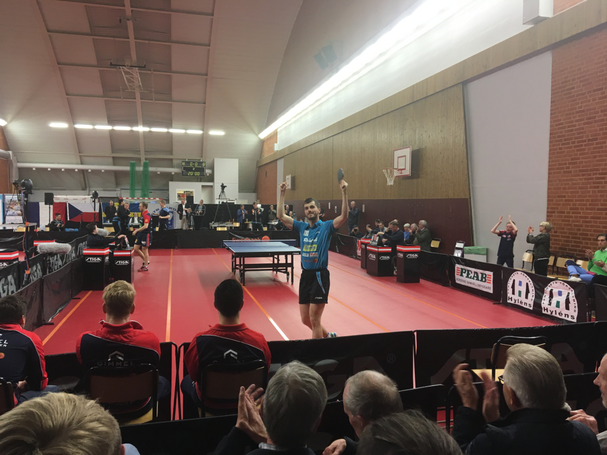 Lagmatchen blev som vanligt och brukligt väldigt jämn och spännande och våra tillresta Värmlandsfans fick valuta för entrépengarna. Simon började mot franske veteranen och f.d storstjärnan Damien Eloi. Där blev det svängigt värre både i spel tack vare Elois konstslag och konstiga slag, men också beroende på de bådas taktiska förändringar under matchens gång. 2-2 var ställningen då Eloi sprang ifrån och Simon hamnade efter med 0-5 innan sidbytet och sedan fortsatte det bara fram till förlust med 2-3 i set. Mehdi hade samtidigt spelat sig fram till en 2-1 ledning på bordet bredvid mot Hampus Söderlund. Efter en stabil insats i det fjärde setet kunde han också avgöra fram till 3-1 och utjämna lagmatchen fram till 1-1!